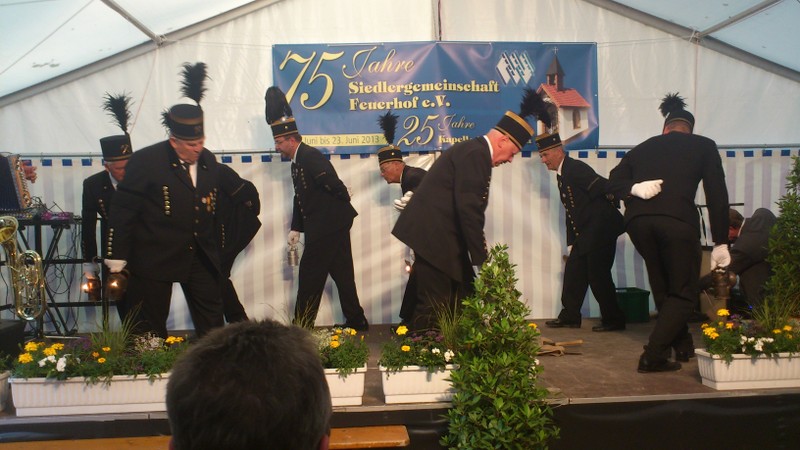 75 Jahre Siedlergemeinschaft und 25 Jahre St.-Barbara-Kapelle, Ehrungen und Auszeichnungen verdienter Mitglieder und viele Glückwünsche standen im Mittelpunkt beim Kommersabend der Siedlergemeinschaft Feuerhof. Die Aufführung des Bergmannstanzes durch den Bergknappenverein verdeutlichte den Ursprung des Ortsteils als Bergbausiedlung.