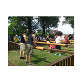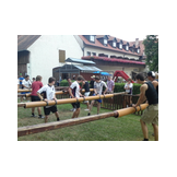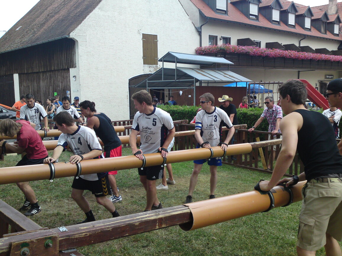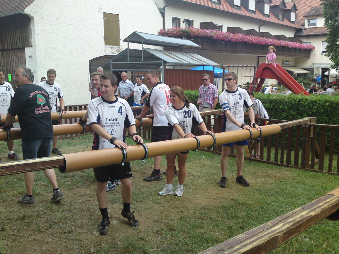 Die Siedlergemeinschaft startete letztes Jahr während ihres Sommerfestes erstmals eine Stadtmeisterschaft im Menschenkicker. Acht Mannschaften meldeten sich nun zu diesem zweiten ungewöhnlichen Turnier. Wie beim Tisch-Kicker müssen fünf Spieler wie Männchen an der Stange versuchen, den Ball beim Gegner im Tor zu versenken. Gefragt sind Taktik, Beweglichkeit und jede Menge Mut. Unter der Schirmherrschaft des 3. Bürgermeisters Hans-Jürgen Reitzenstein, der auch als Marathonschiedsrichter alle zehn Spiele pfiff, kämpften die Mannschaften. Nachdem bereits nach den Vorspielen Schalke 62, 1. FC-Nürnberg-Fanclub Zur Linde 1 und 2 sowie die FC-Knappen trotz guter Leistungen ausschieden, warteten die vielen Zuschauer gespannt auf die Entscheidungsspiele.