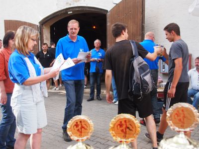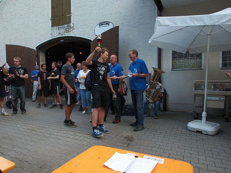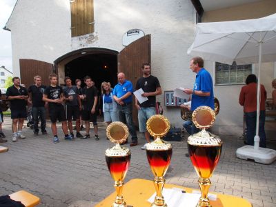 Bei der Siegerehrung begrüßte der 1.Vorsitzende Klaus Frieser besonders den 1.Bürgermeister Michael Göth, 2.Bürgermeister Günter Koller sowie die Stadträte Dr. Stefan Morgenschweiß, Achim Bender, Hildegard Geismann und Dr. Patrick Fröhlich. Angesichts dieser geballten Prominenz sprach Frieser von einer gelungenen und mittlerweile geschätzten Veranstaltung. Besonders erfreulich sei, dass Koller und Morgenschweiß selbst beim Kicker teilgenommen hatten. Sein Dank galt allen Helfern, im Besonderen dem Ehepaar Neidl für die perfekte Planung und Durchführung. Die von 3.Bürgermeister Reitzenstein, Fenster/Türen Heldrich und Helvetia Eckert gestifteten Pokale wurden mit Urkunden an die glücklichen Preisträger überreicht. Außerdem bekamen die ersten drei pro Spieler eine Halbe Malzengel, die weiteren Platzierten pro Mannschaft je eine "Trost-Mass" des süffigen bernsteinfarbenen Bieres, das es nur bei den Siedlern am Feuerhof gibt und das das Vorstandsmitglied Hans Rolf Linke nicht nur wieder sehr großzügig gestiftet hatte, sondern auch dessen Rezeptur er eigenhändig kreierte.