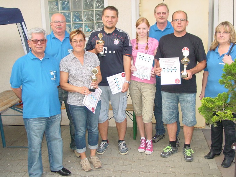 Bild 3: Das mutige Mädchenteam Girlspower konnte zwar nicht siegen eroberte aber durch ihren Kampfgeist die Sympathie der Zuschauer. Zudem machten Sie es den männlichen Gegnern oftmals nicht leicht. Bild 4und 5: Nach spannenden Spielen konnte Siedlervorstand Klaus Frieser (3 v re) gemeinsam mit Schirmherrn Hans-Jürgen Reitzenstein (2 v li) die Pokale und Urkunden an die teilnehmenden Mannschaftsführer übergeben. Manfred Eckert (li) und Turnierleiterin Gudrun Neidl (re) gratulierten ebenfalls und bedankten sich für faire Spiele. (fnk)