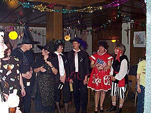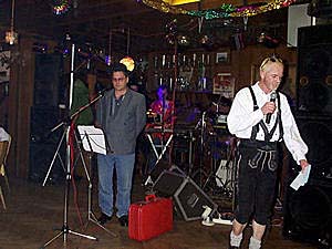 Bereits zur Eröffnung des Faschingsspektakels lies die Gruppe "Miami" das Publikum positiv aufhorchen. Mit bester Sound - und Stimmlage - sie hatten aus Platzgründen nur eine kleine Anlage dabei - überzeugten das Quartett von Anfang an durch eine breite Musikpalette, die für regen Andrang auf dem Tanzparkett sorgte.Dass die Siedler ein lustiges Völkchen sind, wurde in drei Showblöcken bewiesen. Den Beginn machte mit Lederhose und blondem Haar der "Anton aus..." Mit flotten Sprüchen und einigen Witzchen brachte er während des Abend als Moderator die Lachmuskeln in Bewegung. Ein Sketch mit geschichtlichem Hintergrund, gespielt von Anton Fenk und Walter Heldrich, brachte das Publikum zum Ende des ersten Teils zum Lachen.