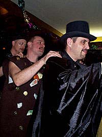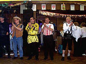 Mit der Frage, warum Beamte nur Stofftaschentücher benutzen und der Antwort: "Auf den Einwegtüchern steht Tempo drauf", leitete der Moderator Anton Fenk den Höhepunkt des Abends ein. In Lackmänteln und Hüten vermummt, betraten sechs Gestalten die Bühne. Als dann die Hüllen fielen und der Faschingshit "Hey Baby" erklang, war das Publikum kaum noch zu halten.