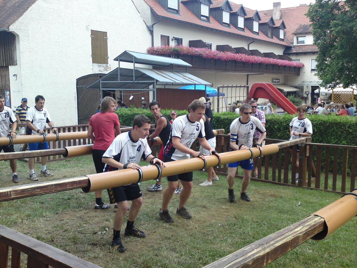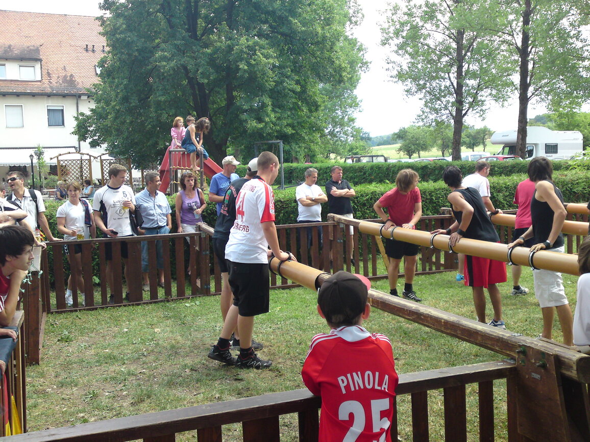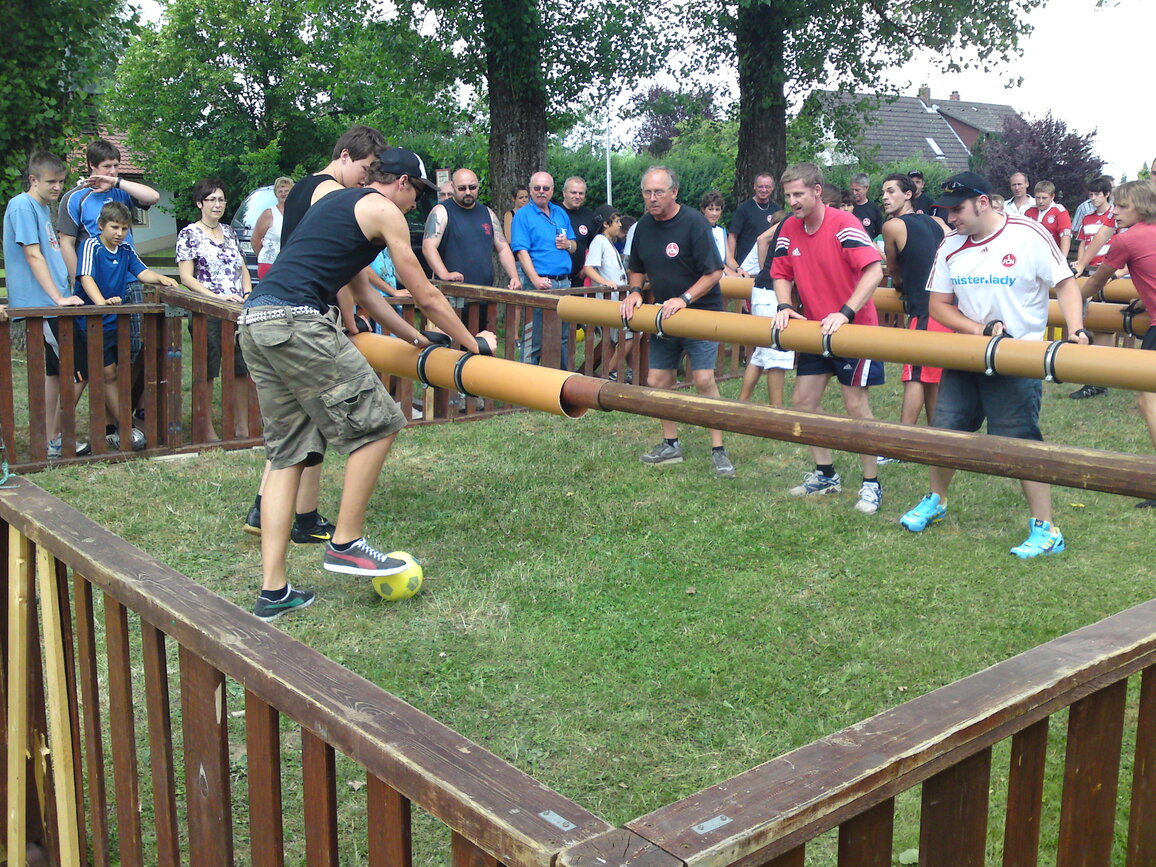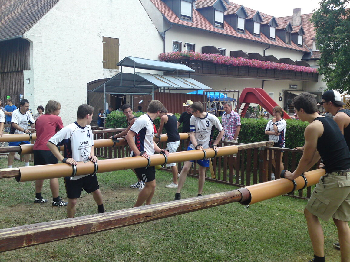 Die Siedlergemeinschaft startete letztes Jahr während ihres Sommerfestes erstmals eine Stadtmeisterschaft im Menschenkicker. Acht Mannschaften meldeten sich nun zu diesem zweiten ungewöhnlichen Turnier. Wie beim Tisch-Kicker müssen fünf Spieler wie Männchen an der Stange versuchen, den Ball beim Gegner im Tor zu versenken. Gefragt sind Taktik, Beweglichkeit und jede Menge Mut. Unter der Schirmherrschaft des 3. Bürgermeisters Hans-Jürgen Reitzenstein, der auch als Marathonschiedsrichter alle zehn Spiele pfiff, kämpften die Mannschaften. Nachdem bereits nach den Vorspielen Schalke 62, 1. FC-Nürnberg-Fanclub Zur Linde 1 und 2 sowie die FC-Knappen trotz guter Leistungen ausschieden, warteten die vielen Zuschauer gespannt auf die Entscheidungsspiele.