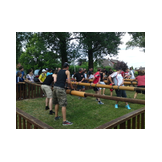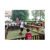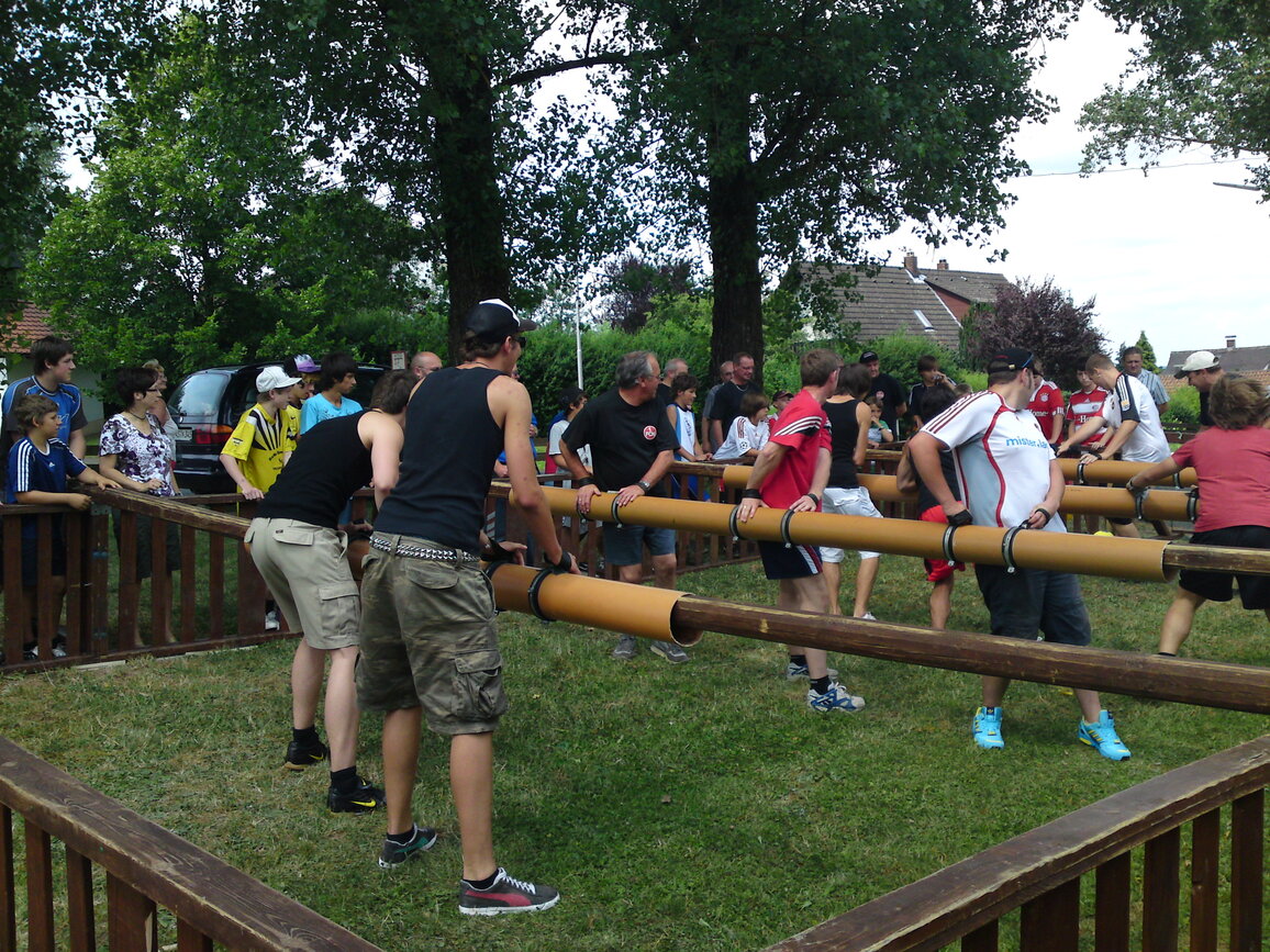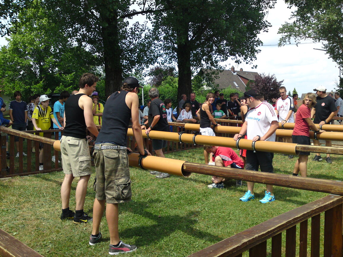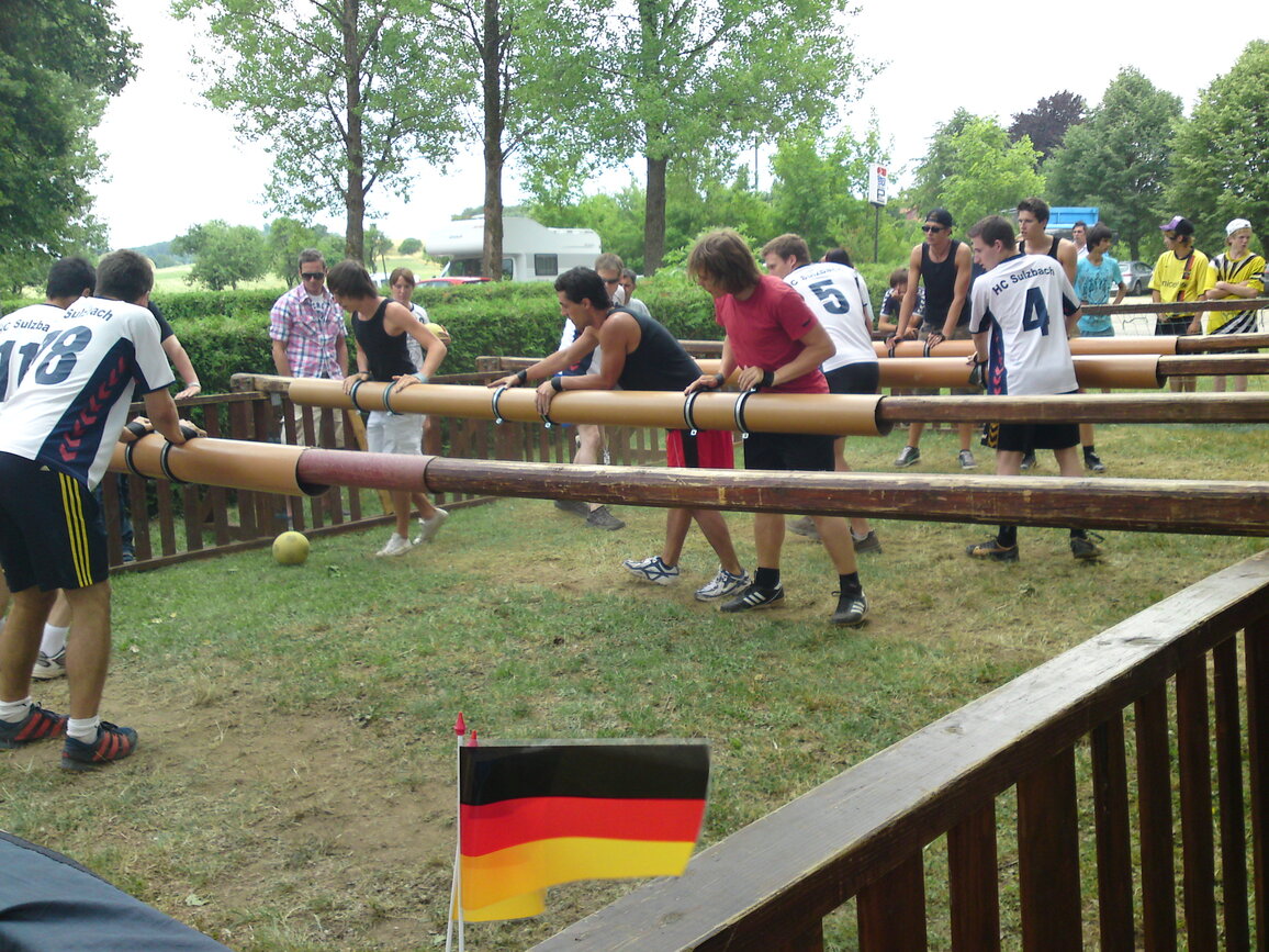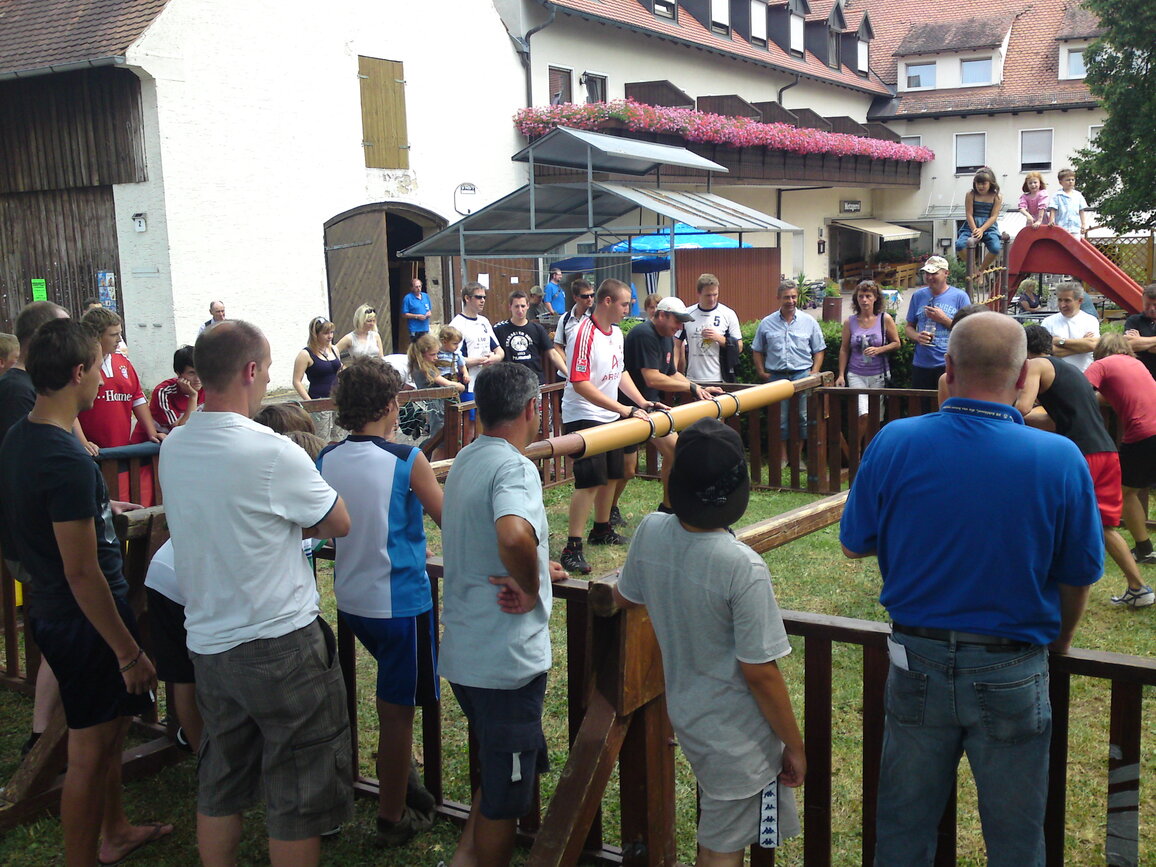 Die Siedlergemeinschaft startete letztes Jahr während ihres Sommerfestes erstmals eine Stadtmeisterschaft im Menschenkicker. Acht Mannschaften meldeten sich nun zu diesem zweiten ungewöhnlichen Turnier. Wie beim Tisch-Kicker müssen fünf Spieler wie Männchen an der Stange versuchen, den Ball beim Gegner im Tor zu versenken. Gefragt sind Taktik, Beweglichkeit und jede Menge Mut. Unter der Schirmherrschaft des 3. Bürgermeisters Hans-Jürgen Reitzenstein, der auch als Marathonschiedsrichter alle zehn Spiele pfiff, kämpften die Mannschaften. Nachdem bereits nach den Vorspielen Schalke 62, 1. FC-Nürnberg-Fanclub Zur Linde 1 und 2 sowie die FC-Knappen trotz guter Leistungen ausschieden, warteten die vielen Zuschauer gespannt auf die Entscheidungsspiele.